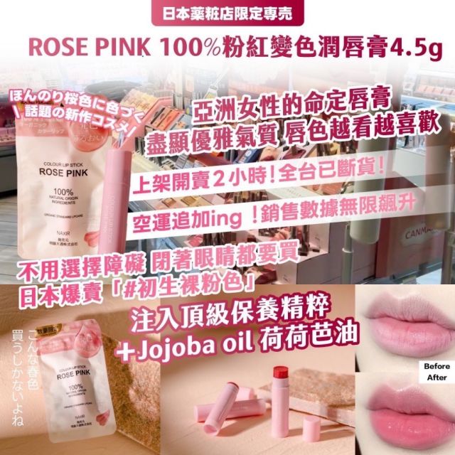 ROSE PINK 100%粉紅變色潤唇膏4.5g(1套2支)(9月尾)
