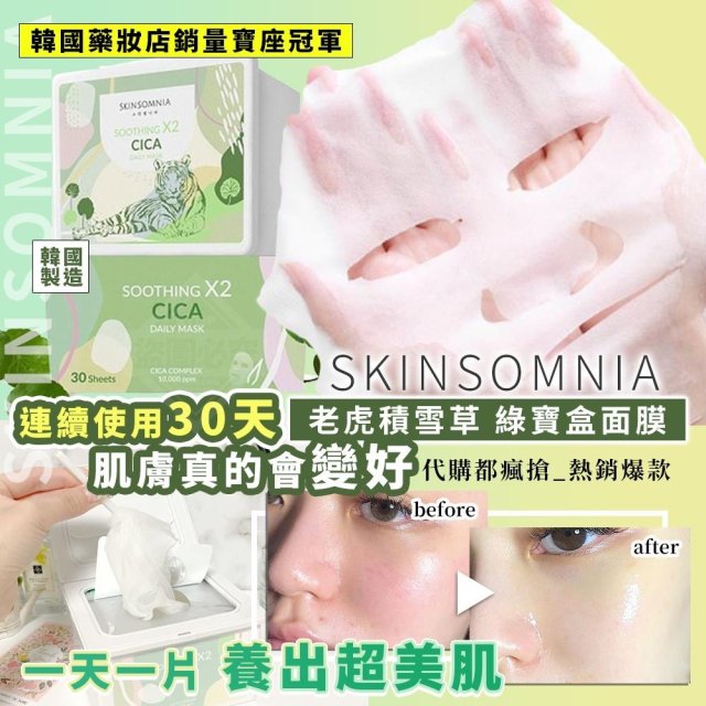 韓國製造 SKINSOMNIA 老虎積雪草 綠寶盒面膜 30入(10月尾)