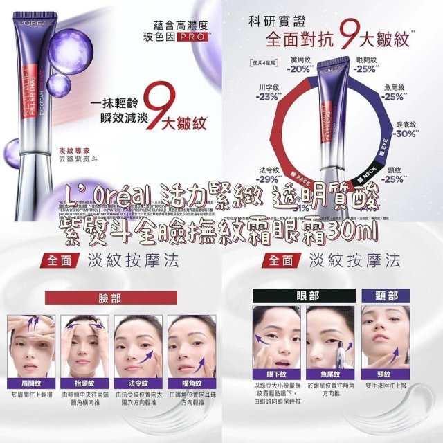 L’Oréal 歐萊雅活力緊緻 透明質酸 紫熨斗全臉撫紋霜眼霜30ml