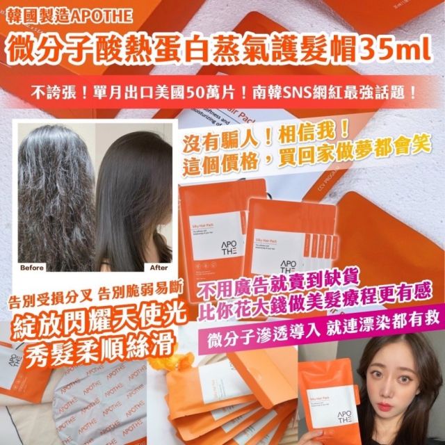 韓國製造APOTHE 微分子酸熱蛋白蒸氣護髮帽 《一組2片》 (1月中)
