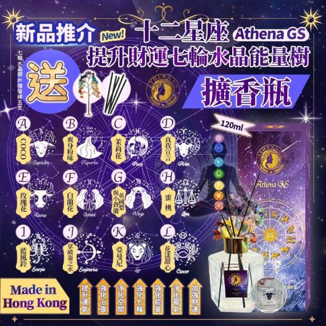 Athena GS 十二星座提升七輪水晶能量樹擴香瓶120ml (贈七輪能量樹+擴香棒5支) (10月尾)