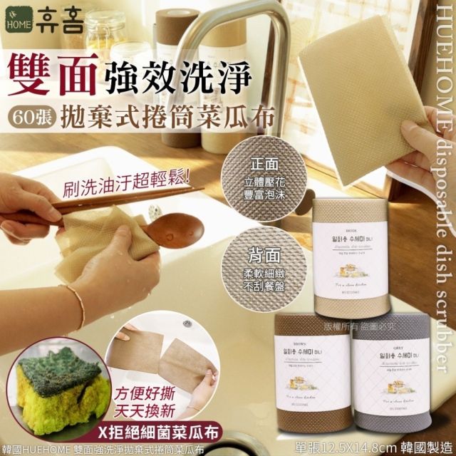 韓國HUEHOME 雙面強洗淨拋棄式捲筒菜瓜布-60張(3月中)