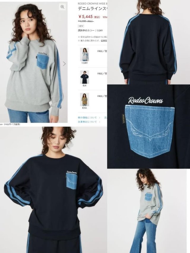 RODEO CROWNS WIDE BOWL牛仔口袋拼條圓領衛衣