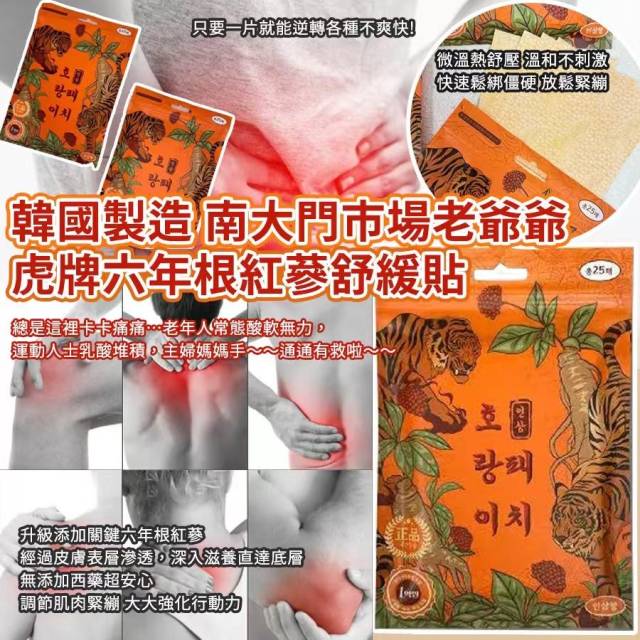 韓國製造南大門市場老爺爺虎牌六年根紅蔘舒緩貼 25入 (1套2包) (11月中)