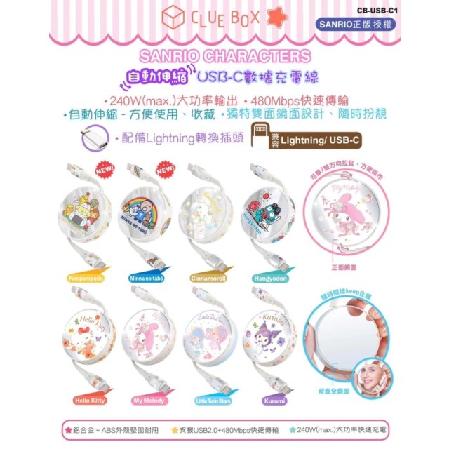 Clue Box X Sanrio character 自動伸縮數據充電電線 (CB-USB-C1) (1月中)