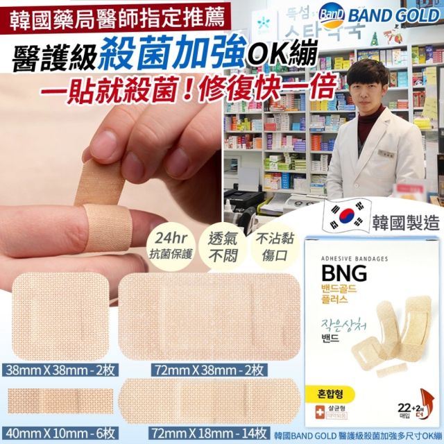 韓國 BAND GOLD 醫護級殺菌加強多尺寸OK繃24枚 (1套4盒) (11月尾)