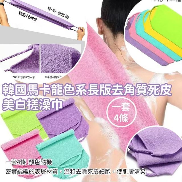 韓國馬卡龍色系長版去角質死皮美白搓澡巾 (1套4條) (11月尾)