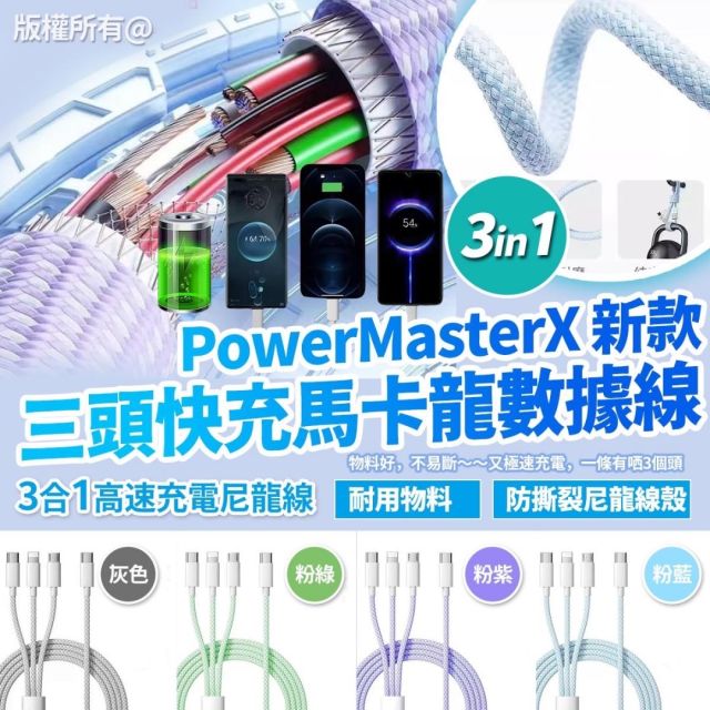 PowerMasterX 新款三頭100%快充馬卡龍數據線(10月頭)