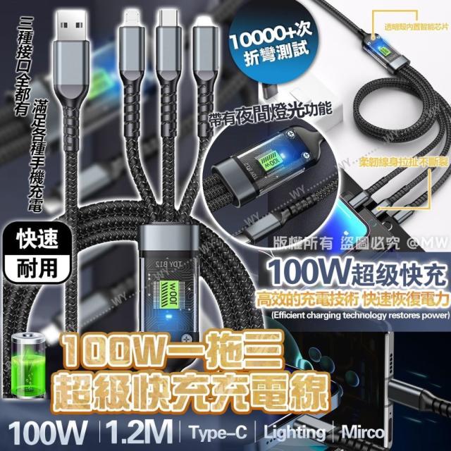美國 100W 一拖三超級快充充電線 1.2M (5月尾)
