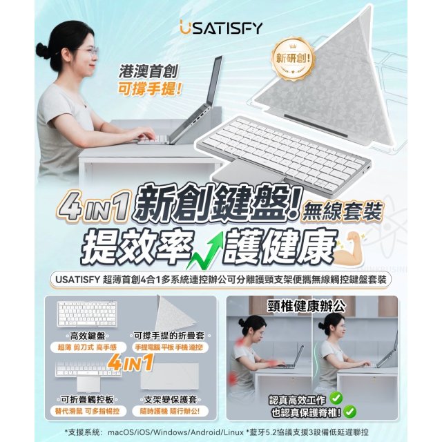 美國USATISFY 超薄首創4合1多系統連控辦公可分離護頸支架便攜無線觸控鍵盤套裝(4月中)