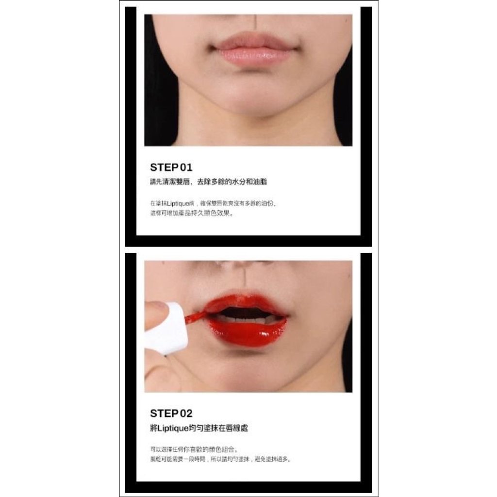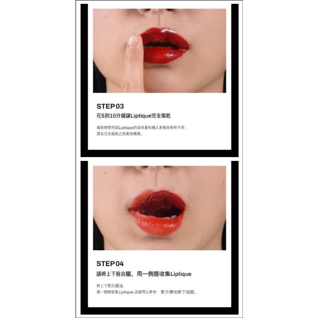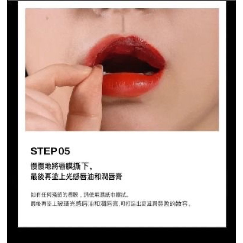 裸唇狀態下均勻塗抹後,等待5-10分鐘直到完全乾燥,然後像貼紙一樣把唇膜撕掉,給雙唇自然染色。